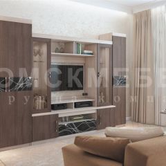 Гостиная выполнена в сочетании фактуры "ясень шимо светлый" и "ясень шимо темный". В серии "Николь" продуманы тумба с местом для телевизора, стеклянные витрины для посуды, полки для книг, фоторамок и т.п., шкаф для различной одежды, а также пенал с шестью полками. В гостиной не предусмотрена подсветка полок.
