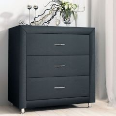 Элегантный комод отличается стильным дизайном и повышенным удобством. Три выдвижных ящика оснащены надёжными направляющими, обеспечивающими лёгкое открытие. Фасад ящиков и стенки комода покрыты обивочным материалом. Для удобства использования и продления срока эксплуатации, рекомендуется использовать стеклянную накладку. Накладка используется в качестве столешницы для комода и защищает его от повреждений и загрязнений.